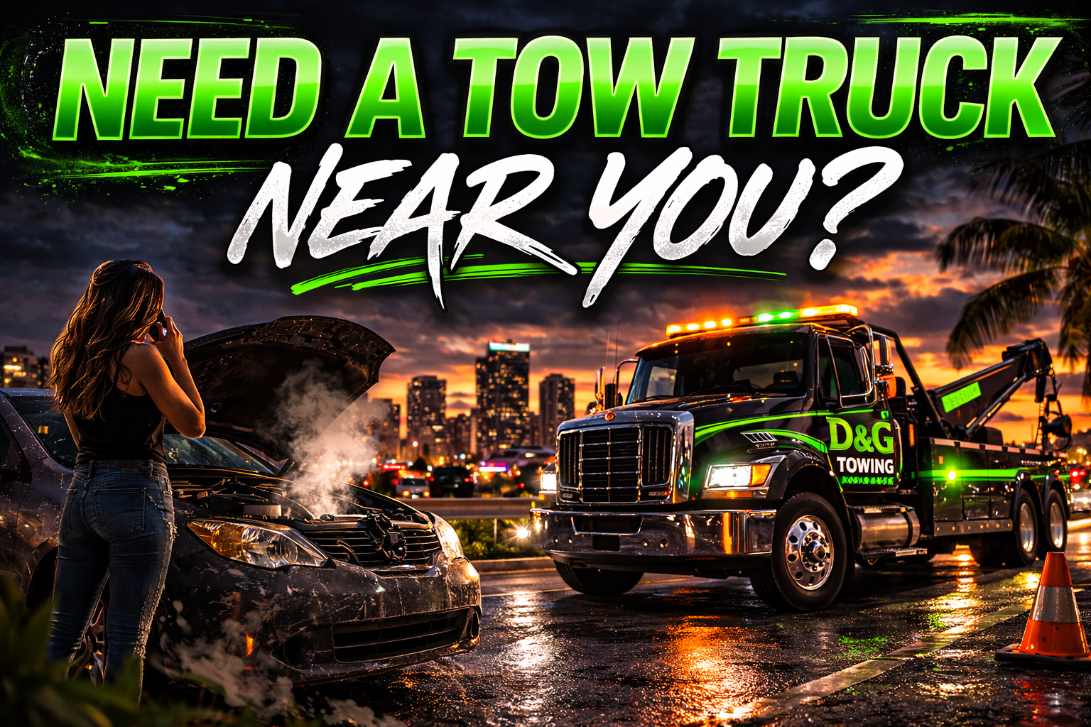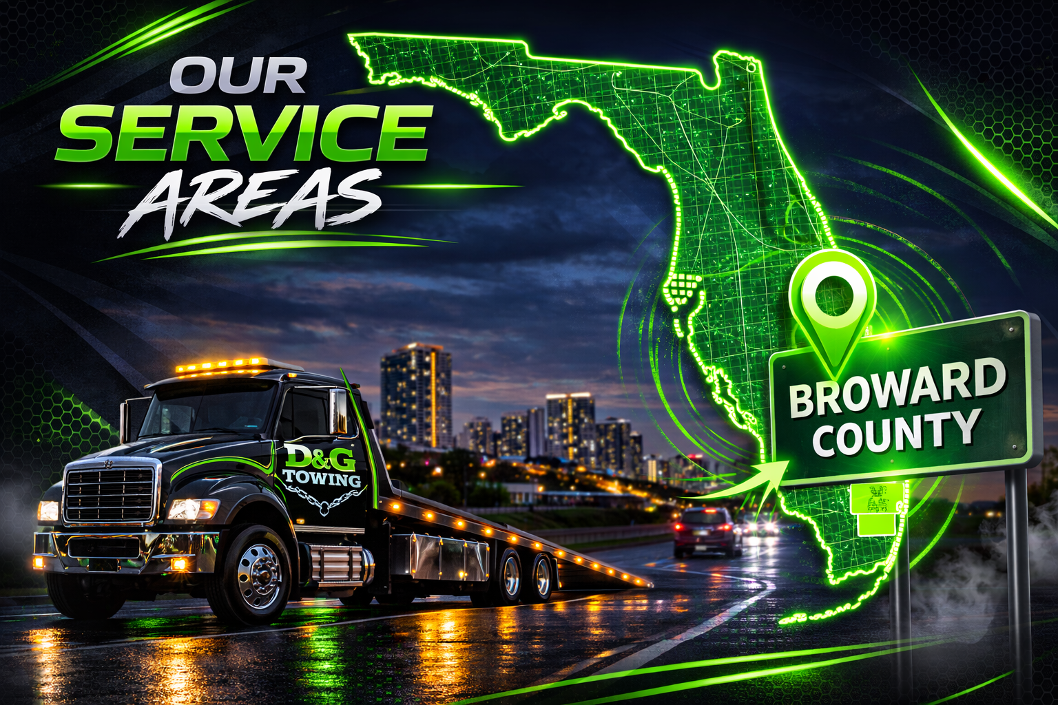 D&G Towing provides 24/7 professional tow truck services throughout Broward County, Florida. Based in Tamarac, we deliver fast response times across Fort Lauderdale, Hollywood, Pembroke Pines, Coral Springs, Pompano Beach and surrounding cities. Whether you need heavy duty towing, private property towing, repossession services, junk car removal, or emergency roadside assistance, our licensed and insured team is ready to respond day or night.